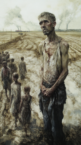A dark, eerie image of a Russian family inside a small, bleak hut, with hollow eyes and empty plates, depicting the harsh reality of Stalin's forced industrialization and the resulting famine --ar 9:16