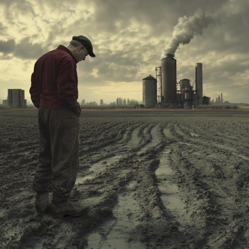 Create an image that conveys the god Enlil's proclamation of famine, with the words, "Let supplies be cut off from the people; in their bellies, let fruit and vegetables be wanting!" Content: Enlil's declaration, famine, people's hardships. Medium: Painting. Style: Mythological with a sense of deprivation. Lighting: Dim and desperate. Colors: Scarcity of warm and nourishing colors. Composition: Painted scene reflecting Enlil's declaration of famine and the ensuing suffering. --ar 16:9 --v 5.1 --style raw --s 750