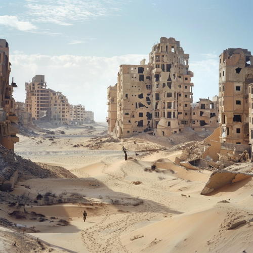 apocalyptic backdrop, scene in the desert, sandstorm, wearing oxygen masks, many people, A sky adorned with the setting sun, imax film, Dolby Vision HDR --ar 16:9