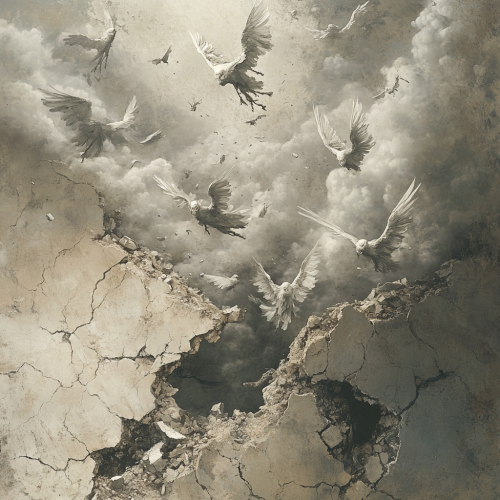 Please create a realistic, vivid illustration of a scene where the ground is cracked and shaken by an earthquake, people are frantically fleeing to survive, and countless angels covered in gray dust are flying in the sky. The cracks in the land and the angels soaring above should be depicted clearly. The scene should be beautiful, dreamy, and fantastical, yet also depict a devastating and catastrophic atmosphere ,Please draw the angels as winged humans rather than birds.