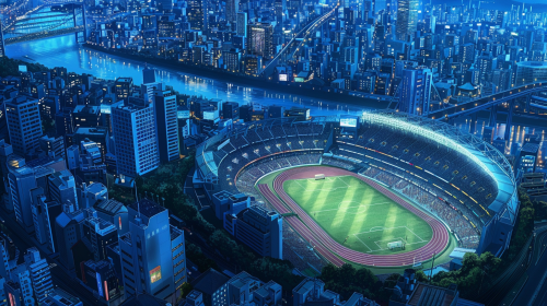 japanese anime style, stadium in city, bird eye view, high quality --ar 16:9