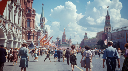 Soviet city scene in Moscow, Russia on July 25, 1966, during the height of the Cold War. The foreground shows citizens in summer attire walking along Red Square, with banners celebrating Soviet achievements in space exploration. In the background, the Kremlin and Lenin’s Mausoleum stand proudly under a bright sky, with military parades reflecting Soviet strength. The lighting is crisp and clear, highlighting the political and cultural power of Moscow during this era. --ar 16:9 --v 6.0 --style raw