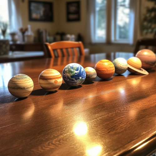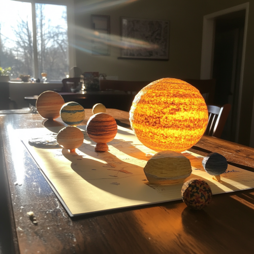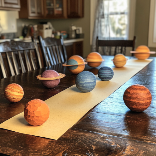 realistic photo taken with an iPhone. A realistic model of all the planets in the solar system. It's sitting on a dining room table and looks like a middle schooler made it. Each of the planets is labeled