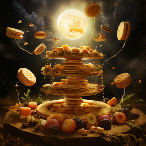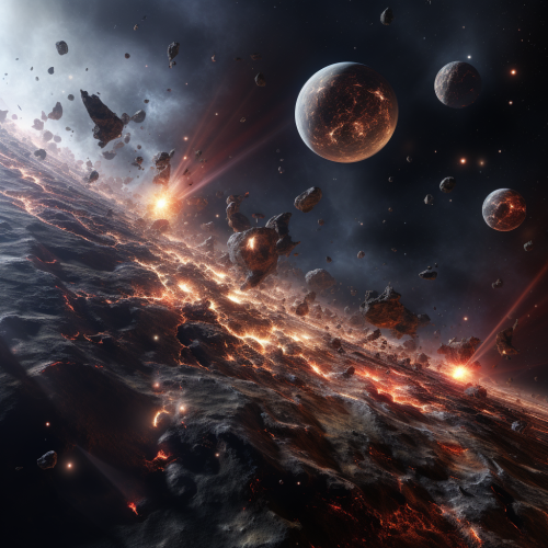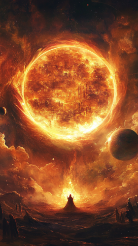 Create an image of the sun as an ancient storyteller, sitting on a throne of fire in the center of the cosmos, narrating the creation of the universe to a circle of attentive planets. The sun’s flames should dance with each word, projecting scenes of cosmic history into the sky. The overall scene should be epic and wise, with a sense of timelessness and grandeur --ar 9:16