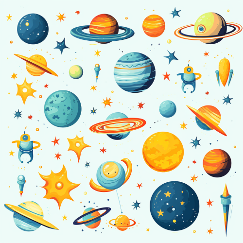 collection of childrens style sky objects like planets, stars , comet, moon, asteroid,, rocket ship , sun,