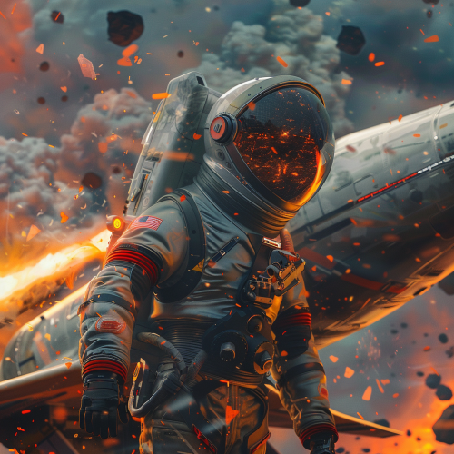 An Futuristic astronaut standing infront of a spaceship thats blasting off.