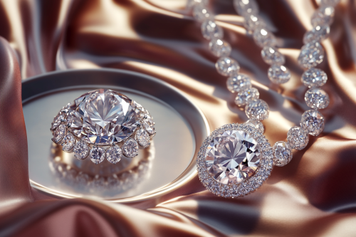 Realistic photo of an opulent diamond ring with a large, flawless centerpiece stone, surrounded by smaller accent diamonds, placed alongside a dazzling diamond necklace with a radiant pendant, each diamond exhibiting exceptional clarity and fire, presented on a luxurious silk-lined tray, exuding exclusivity and elegance. Photorealistic, realistic image, 8K resolution --ar 3:2 --v 6.1 --style raw