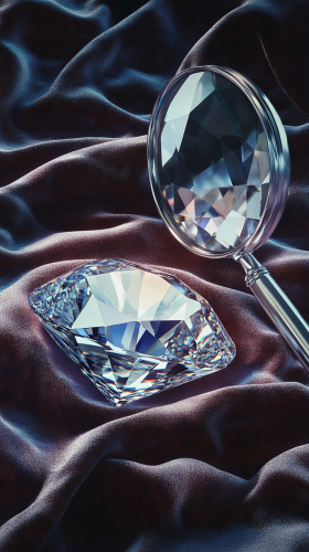 Generate a digital art for A large, sparkling diamond resting on a velvet cushion on the left side of the screen. The background is textured with a smooth, luxurious fabric pattern in the primary color #0A84FF, creating a rich and elegant atmosphere. On the right side, a magnifying glass is hovering, focusing on the diamond, with subtle reflections and highlights to emphasize its brilliance. The overall scene is designed to be minimalistic, ensuring that the slide content remains the focal point. The colors used are primarily #0A84FF for the background, with white and light gray for the diamond and magnifying glass, and subtle shadows to add depth without overwhelming the content. . --ar 9:16