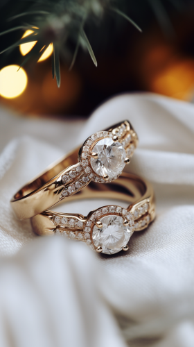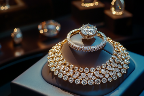 Real-life image of a luxurious diamond ring alongside a diamond-encrusted necklace, both with radiant gemstones in an intricate setting, positioned on a polished jewelry display, emphasizing elegance and sophistication. Photorealistic, realistic photo, 8K resolution --ar 3:2 --v 6.1 --style raw