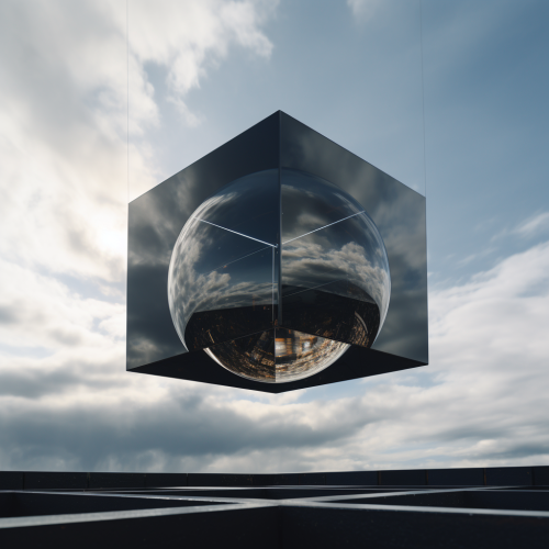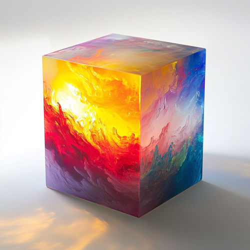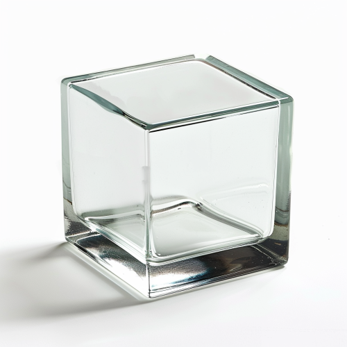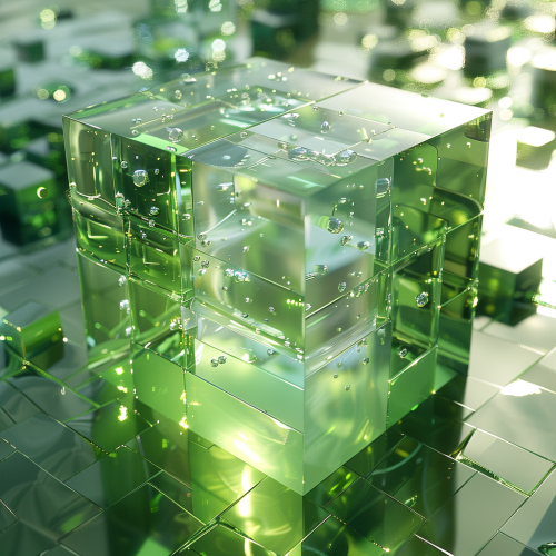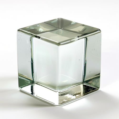 floating in open outdoors space, white, glass cube with a thousand transparent boxes stacked on top of each other, prism reflections from sun light rays behind, shining and reflecting through the glass. The overall design is made from multiple layers of glass material. It features an interactive installation and is presented in the front view. This artwork embodies the aesthetic style inspired by Japanese minimalism