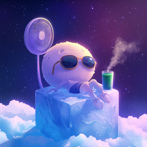 Illustration of a Personified moon character with sunglasses drinking an iced matcha and relaxing on an ice cube in outer space with a cold fan blowing on him. Meditation vibe.