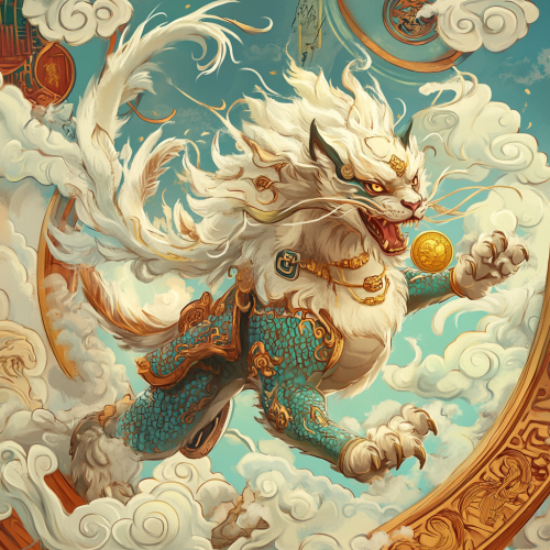 A stylized illustration of a Pi Xiu in dynamic pose, holding a gold coin in its claws, with intricate fur texture and jade-like scales, against a backdrop of swirling clouds and ancient Chinese symbols. Bold lines and vibrant colors inspired by traditional Chinese ink painting --v 6.1 --s 50