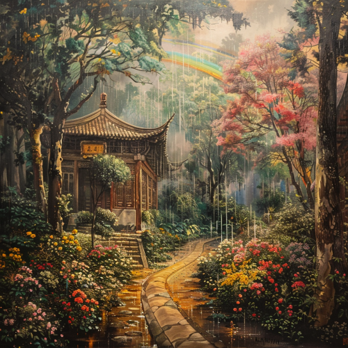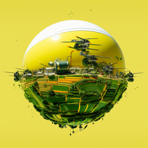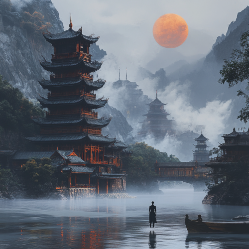 Spherical shape surrounded by swirling Chinese elements and colors.
