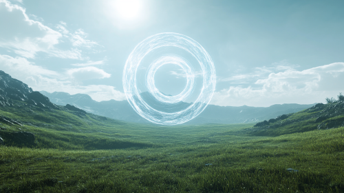 spherical light anomaly surrounded by four concentric rings of light, the third ring is double helical in shape, in the sky over a grassy valley, middle of the day, no clouds, digital art, natural lighting, cinematic, 8k, ultra detailed, --ar 16:9 --s 90