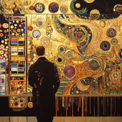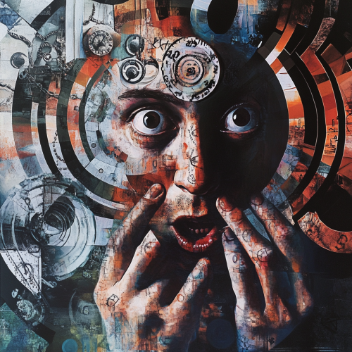 an abstract representation of obsession, featuring a person with intense facial expressions, surrounded by repetitive patterns, like swirling spirals and endless loops. The person's hands are tightly clenched, and their eyes are wide open, staring intensely at a single point. The background is filled with overlapping symbols, clocks, and chains, creating a sense of overwhelming pressure. The colors are a mix of dark blues, grays, and reds, conveying a feeling of anxiety and compulsion, with high contrast shadows and dramatic lighting