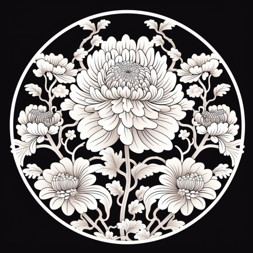 classical chinese illustration of Chrysanthemums and naturual design elements, flat vector, simplified detail, symmetry, negative space in center of composition, black and white only, thick lines, no shading, spherical composition