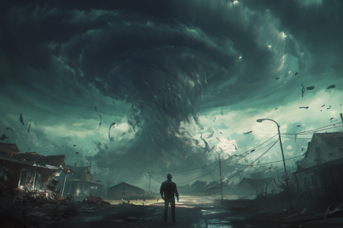 a vague male figure at the center of a giant tornado in the middle of dark dilapidated town during a thunderstorm + horror + art style of Capullo, Brom, Whelan, aly fell rutkowski, art germ, rossdraws, and franzzeta + art station + ultra detailed + hyper realistic + 8k --ar 3:2 --niji 6