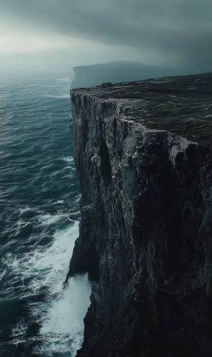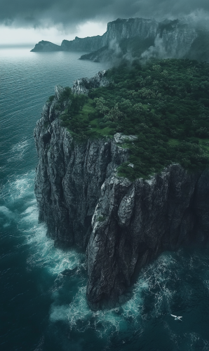 CAMERA IS POSITIONED AT THE TOP OF THE CLIFF, elevated aerial shot, a cliff on a spooky stormy island, the camera is positioned at the top of the cliff and is looking down the cliff at the choppy stormy sea down below, the weather is dark gloomy spooky and stormy, atmospheric, thunder, hyper realistic, ultra realistic, photoreal, 4k, 8k, --ar 3:5