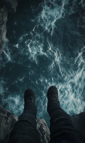 a person hanging off the edge of a cliff looking up at the camera, the person looks scared, the setting is a spooky stormy british island, it is dark and scary, below the person's dangling feet you can see the roaring sea, stormy thunderous waves, the person is scared, hyper realistic, ultra realistic, photoreal, 4k, 8k, --ar 3:5