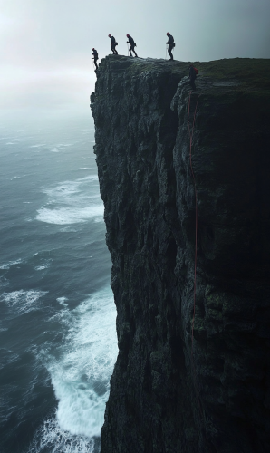 elevated view shot, aerial shot, pov looking over the edge of the top of the cliff, 4 people climbing up the side of a cliff in a dark stormy spooky british island, you can see the menacing sea below them, choppy waves, one person is at the top of the cliff and is holding on dangling off the edge looking scared, spooky, ultra realistic, hyper realistic, 4k, 8k, --ar 3:5