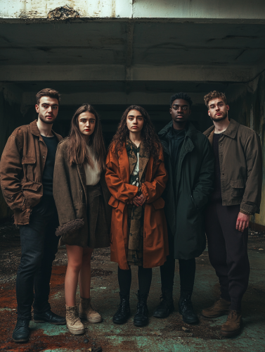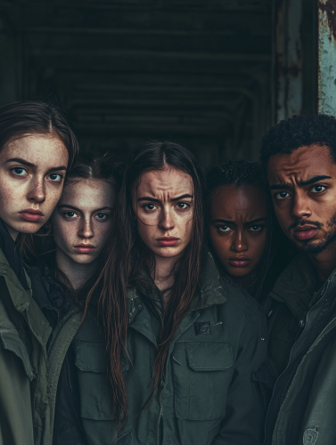ultra wide shot, camera is far away, full bodies are in shot, a row of five people, they look slightly scared, of various genders and ethnicities, all stood next to each other in a row facing the camera, the lighting is fairly dark so their faces are not clear, the setting is an abandoned army barracks on a stormy british island, hyper realistic, ultra realistic, photoreal, dark, spooky, 4k, 8k, --ar 3:4