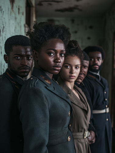 ultra wide shot, camera is far away, full bodies are in shot, a row of five people, of various genders and ethnicities, some black people some white people, all stood next to each other in a row facing the camera, the lighting is fairly dark so their faces are not clear, the setting is an abandoned army barracks on a stormy british island, hyper realistic, ultra realistic, photoreal, dark, spooky, 4k, 8k, --ar 3:4