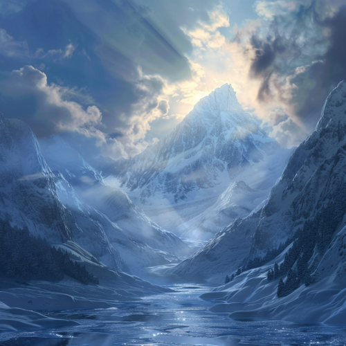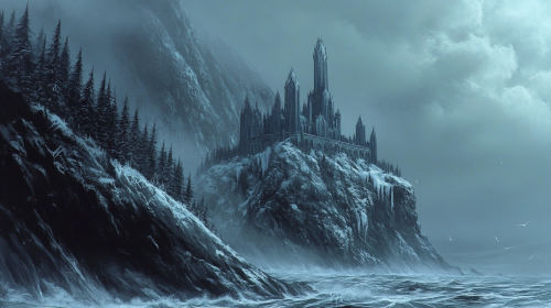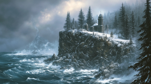 snowy arctic island covered in pine forests just above a stormy sea, the island looms 150 feet over the water in icy, treacherous cliffs, two mausoleums stand on the northern end of the island, 1990s ravenloft art --ar 16:9