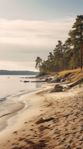 Landscape inspired by the Baltic region, showing a coastal scene with pine forests leading to the sea, sand dunes, and rocky shores. The image features soft, diffused light that highlights the natural beauty and simplicity of Estonia, Latvia, or Lithuania. The atmosphere is peaceful, with hints of mist over the calm water, creating a tranquil mood. --ar 9:16 --v 5.1 --style raw