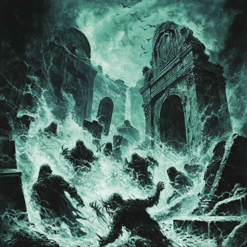blackened death metal cover, nighthaunt figures bursting out of the ground and grabbing a woman by the leg as she is being pulled into the grave, enviroment is destroyed mausoleums and tombstones in an icy graveyard, illustration