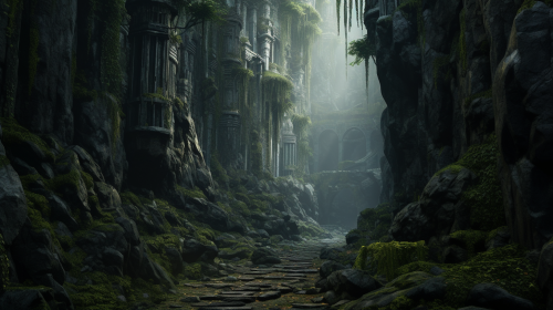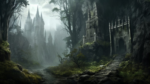 Gothic art style, first person view, path through dense forests with steep cliffs, --ar 16:9