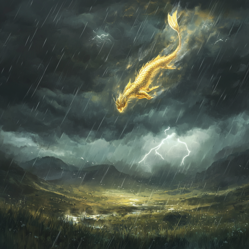In the far distance, a golden-scaled Capricorn with the body of a horse and a fish tail glides through heavy storm clouds. The creature is barely visible through the swirling darkness as it swims across the sky. Lightning flickers behind it, illuminating its form against the backdrop of a rain-soaked grassy valley. The valley below, drenched and windswept, stretches out in shades of green and gray under the ominous stormy sky, creating a haunting yet beautiful dark fantasy atmosphere in the style of Studio Ghibli.
