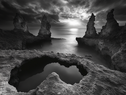high contrast black and white landscape photograph based on the style of photographer William Patino capturing an odd number of rocks on the shoreline of the ocean being engulfed with shallow waves crashing around them, the sun is breaking through on an off centred horizon beneath a really dark circular cyclone storm cell , Bursts of lightning in the backfround illuminating the cloud from beneath with glowing edges. The foreground only the lower 3rd of the image, it is taken low to the ground highlighting the light reflecting off of chanels carved in the rock filled with trapped pools of water, they are running from the bottom outer corners with an inward direction pushing to the bottom centre third of the image directing the viewers eye to a centre focus. Camera shutter speed 2/3 of a second, wide angle 16mm lens view, cinematic lighting. hyperrealistic 4k photographic quality. --ar 2:1