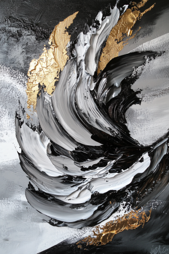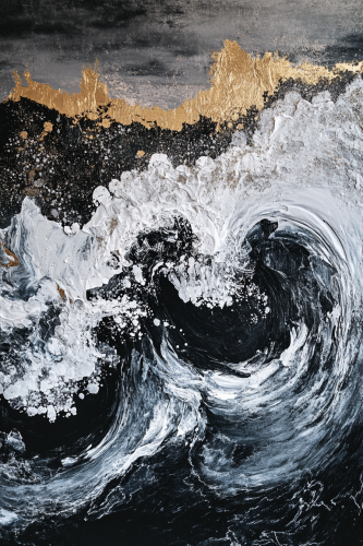 abstract painting inspired from Sea waves that destroyed on beach rocks , sea drops , Arabic theme , curvey dynamic brushes , 16k , luxury theme , colors black grey silver gold --ar 2:3