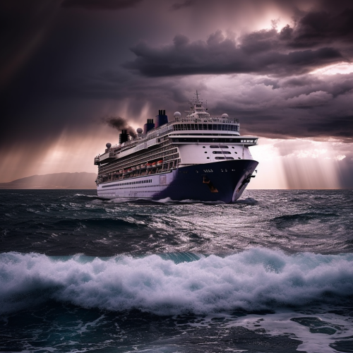 a cruise ship with a crown on the side sailing through very terbulant waters with large waves. the sky is fullmof darkgray and purple clouds and lightning strikingthe water in the distance. dystopian fantasy in real life photo --v 5.0