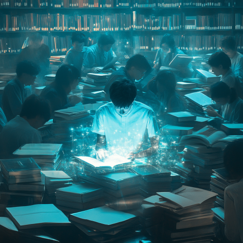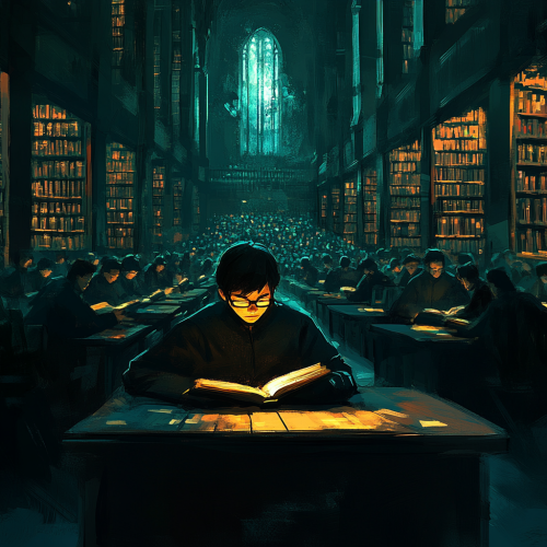 A dark library which is huge and goes on forever with millions of students sitting at tables in it all reading books. The colors are dark and muted. However, one student has a bright book that is glowing brightly and he appears confident and wears glasses.