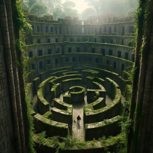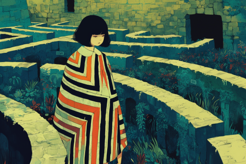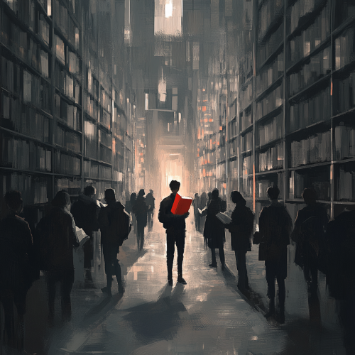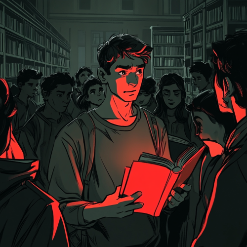 A dim library in muted shades of grey with many students holding grey books. However, one student holds a bright red book and looks confident, other students are looking at him in shock and jealousy.