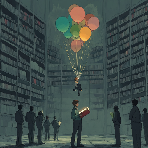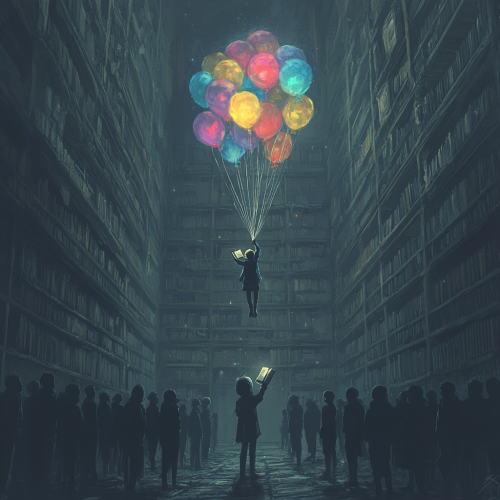 A towering, dimly lit library with high shelves, everything in muted grey tones. Hundreds of sad students stand on the ground below, each holding a grey book. The atmosphere is heavy and somber, with the students blending into the dull, colorless surroundings. Above them, one student floats in the air, tied to bright, glowing, colorful balloons, holding a bright, glowing, vibrant book.
