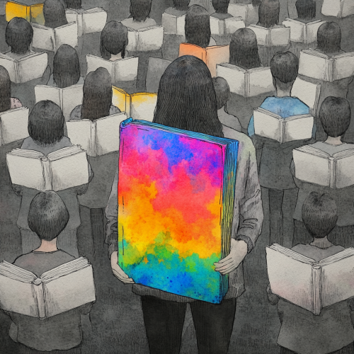 A large room filled with students, each reading dull, grey books. The atmosphere is muted, with the students surrounded by a sea of grey and drab tones. However, one student stands out, holding a bright, colorful book that radiates vibrant hues. The colorful book contrasts sharply with the grey books that the other students are reading, drawing attention to the single student who holds it. The rest of the scene remains mostly grey and subdued, emphasizing the vividness of the colorful book.