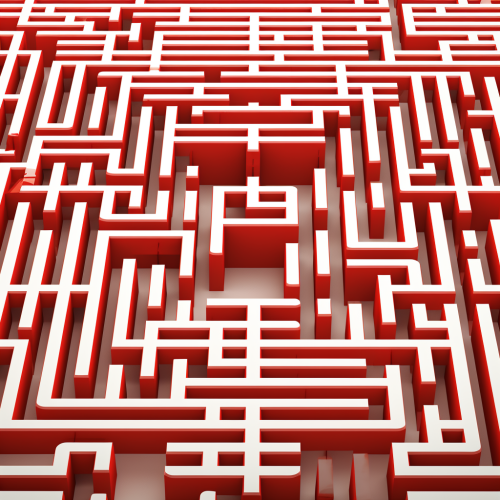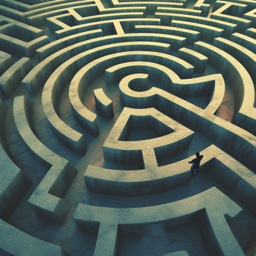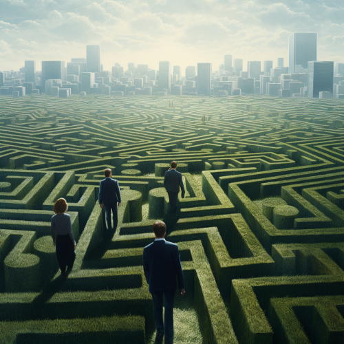 a white and empty room with only a desk in the middle of the room. A man sits behind his large desk. He is wearing a suit, his face is astonishing because on his desk several computer screens, several laptops, several computer keyboards and several computer mice are placed on the desk. Lots of cables fall from the desk to the floor. This must represent a man who finds himself lost in the face of all his computer machines. The background of the image is white --s 750