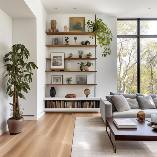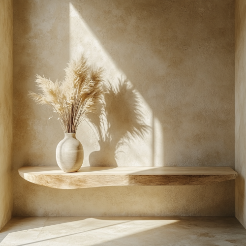 Create a cozy kitchen scene where 80% of the image focuses on a large, smooth white wall that serves as the primary element. The wall should be perfectly smooth and evenly lit with warm, natural light to create a clean and inviting space for wallpaper. In the background, at the extreme edge of the frame, include a blurred, warm-toned wooden shelf with a few simple kitchen items, like a small stack of bowls or a hanging towel. A hint of a soft kitchen rug can be visible to suggest warmth without taking attention away from the wall.