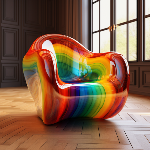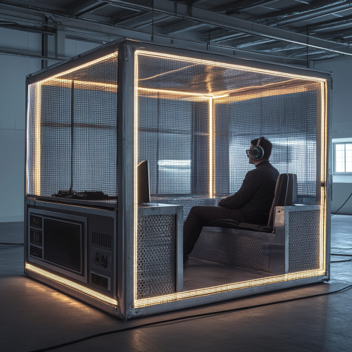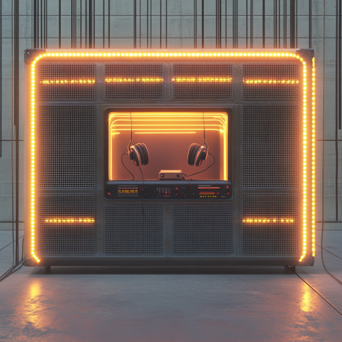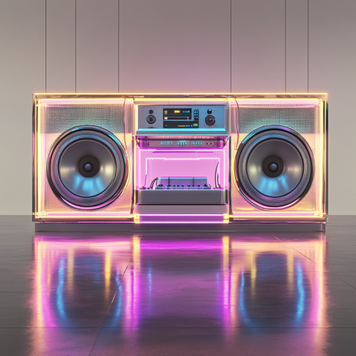 Create a photorealistic image of a large indoor studio installation in the shape of a classic boombox. The boombox is designed with a metal frame and features large, circular speakers on both sides, with minimalistic grating and subtle neon lights outlining the structure. The central section, where the cassette deck would be, is an open space with a seating area and headphones, inviting people to sit and listen to music. The neon lighting is sleek and refined, enhancing the design without overpowering it. The installation is set in a modern indoor space with a polished floor, reflecting the structure's details.