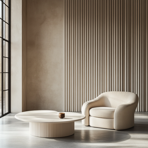 : : A minimalist interior design featuring two round coffee tables and an armchair, arranged in front of a wall with vertical strips, creating a serene atmosphere. The room is bathed in soft natural light from large windows on the left side, highlighting the clean lines and simplicity of each element against a muted beige background. This composition emphasizes space for text or product display at eye level.