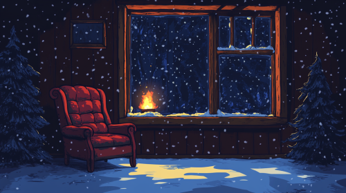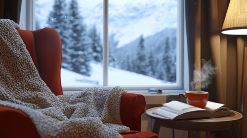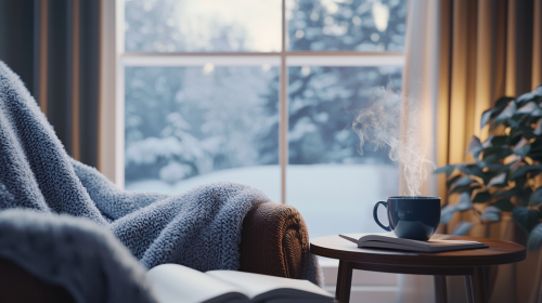 Create a high-quality, realistic horizontal photo for a cozy winter scene. Place a comfortable armchair near a window, covered with a soft, fluffy blanket. Next to it, on a small table, is a steaming cup of tea and an open book. Outside the window, a snowy landscape is visible, while the interior exudes warmth, calm, and a sense of peace. The atmosphere should feel inviting and serene, capturing the essence of winter comfort indoors. --q 2 --ar 16:9