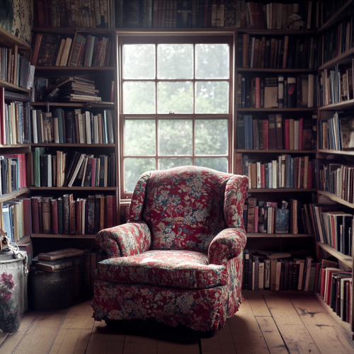 Create a photorealistic image of a studio installation. The setup features a large, open book positioned vertically, with one side of the book forming a comfortable seat or armchair. The seat is integrated into the book, with soft cushions and ergonomic design. On the opposite side, where the other page of the book would be, there's a bookshelf embedded into the page, filled with a variety of books. The background is a minimalistic studio setting, focusing on the book installation.