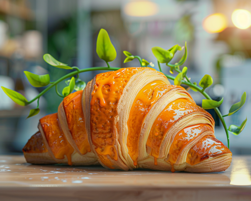 croissant with an orange paint layer on top as a plastic decoration on a shelf of a coffee shop, greenery growing from it, product design, interior design, realistic --ar 5:4 --v 6.0