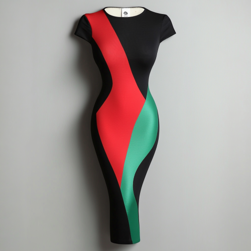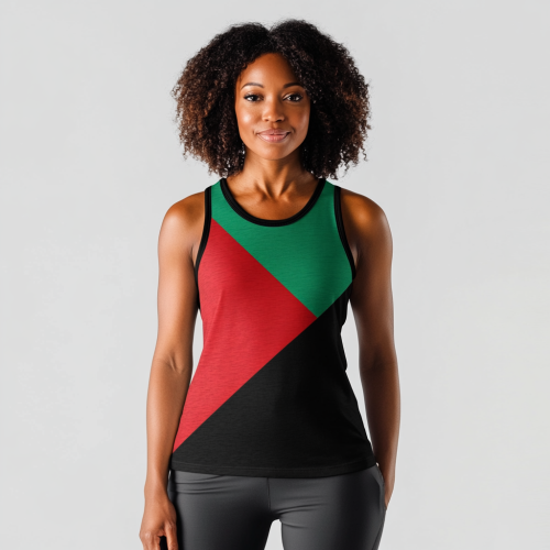 Design a women's sleeveless t-shirt (tank top) fully covered by the flag design provided, displayed on a black woman with a sleek, athletic build. The tank top should feature a large red triangle on the left, with the top half in green and the bottom half in black, exactly matching the flag's layout. The design should wrap seamlessly around the entire garment, with clean edges around the armholes and neckline to complement her silhouette. The vibrant red, green, and black colors should stand out boldly against her skin tone, creating a striking, modern, and fashionable look.