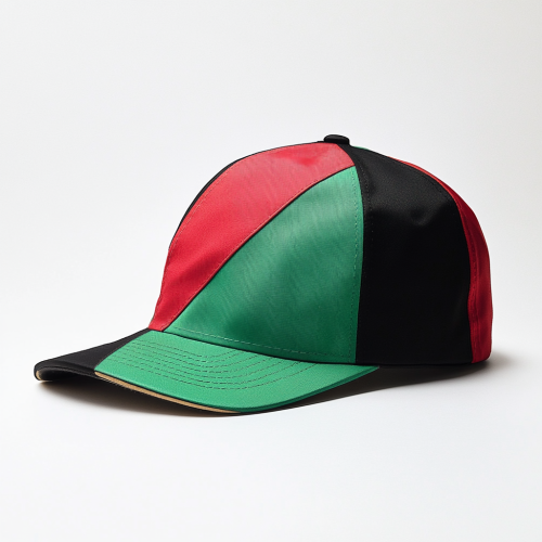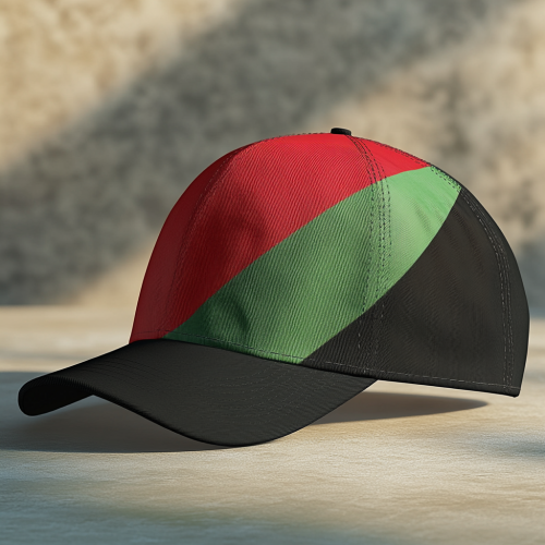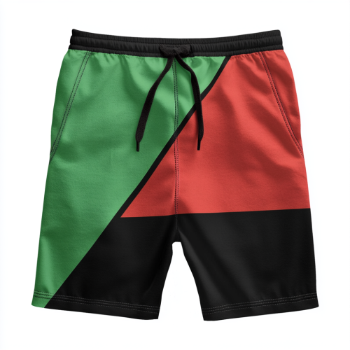 Design a men's swim short entirely covered by the flag design provided. The swim short should feature a large red triangle on the left side, with the top half in green and the bottom half in black, replicating the flag's layout. The design should cover the entire swim short, including the front, back, and sides, ensuring the colors--red, green, and black--are vibrant and stand out against the fabric. The swim short should have a comfortable fit with an elastic waistband and a stylish, sporty look that emphasizes both functionality and design.