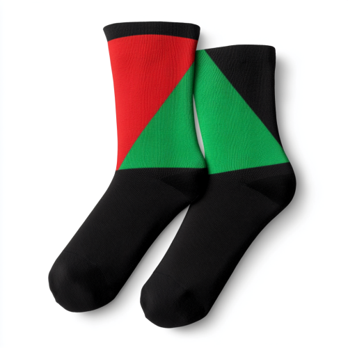 Design a pair of socks entirely covered by the flag design provided. The socks should feature a large red triangle on the left side, with the top half in green and the bottom half in black, replicating the flag's layout. The design should wrap seamlessly around the entire sock, including the foot and calf sections, ensuring the colors--red, green, and black--are vibrant and bold. The socks should have a comfortable fit with clean edges at the cuff and a smooth pattern that enhances both style and wearability.