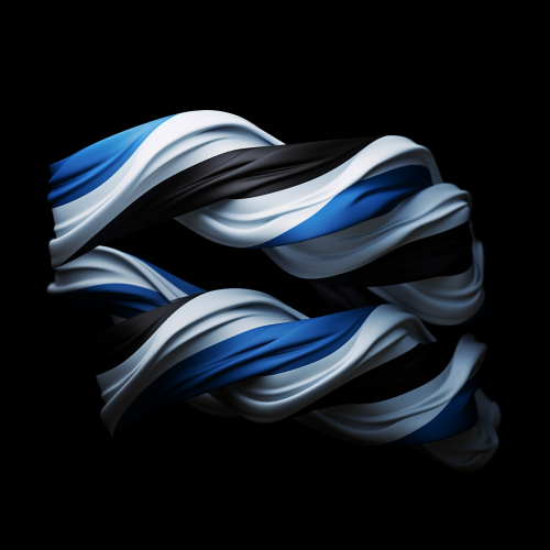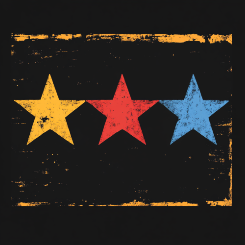a rectangular flag with three stylised 4 pointed stars. the first star is yellowish, the second is blueish, the third is small and reddish. background is black. minimalistic design.