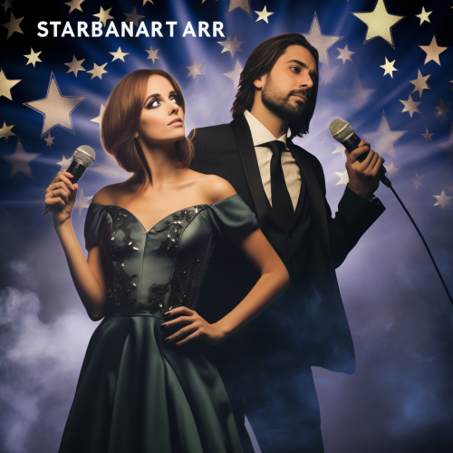 fundraiser poster, extraordinary stars, female vocalist back to back with male magician, realistic photo of persons, stylised and dreamy background --s 50